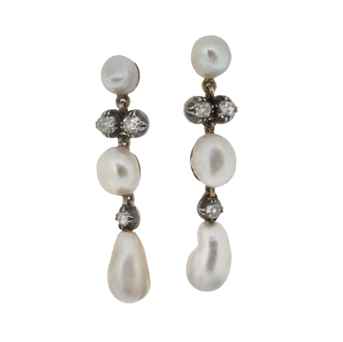 A pair of pearl and diamond drop earrings. Each earring is set with three natural pearls and...