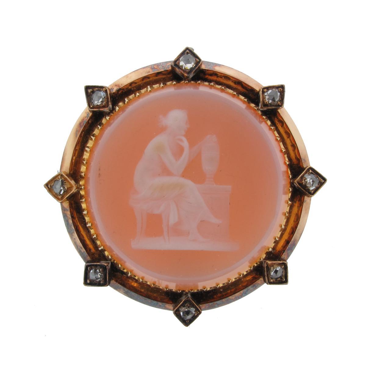 A carved hardstone cameo brooch, depicting a seated woman contemplating an urn on a pedestal. The gold circular mount set with eight rose cut diamonds. The cameo 2.5cm wide.