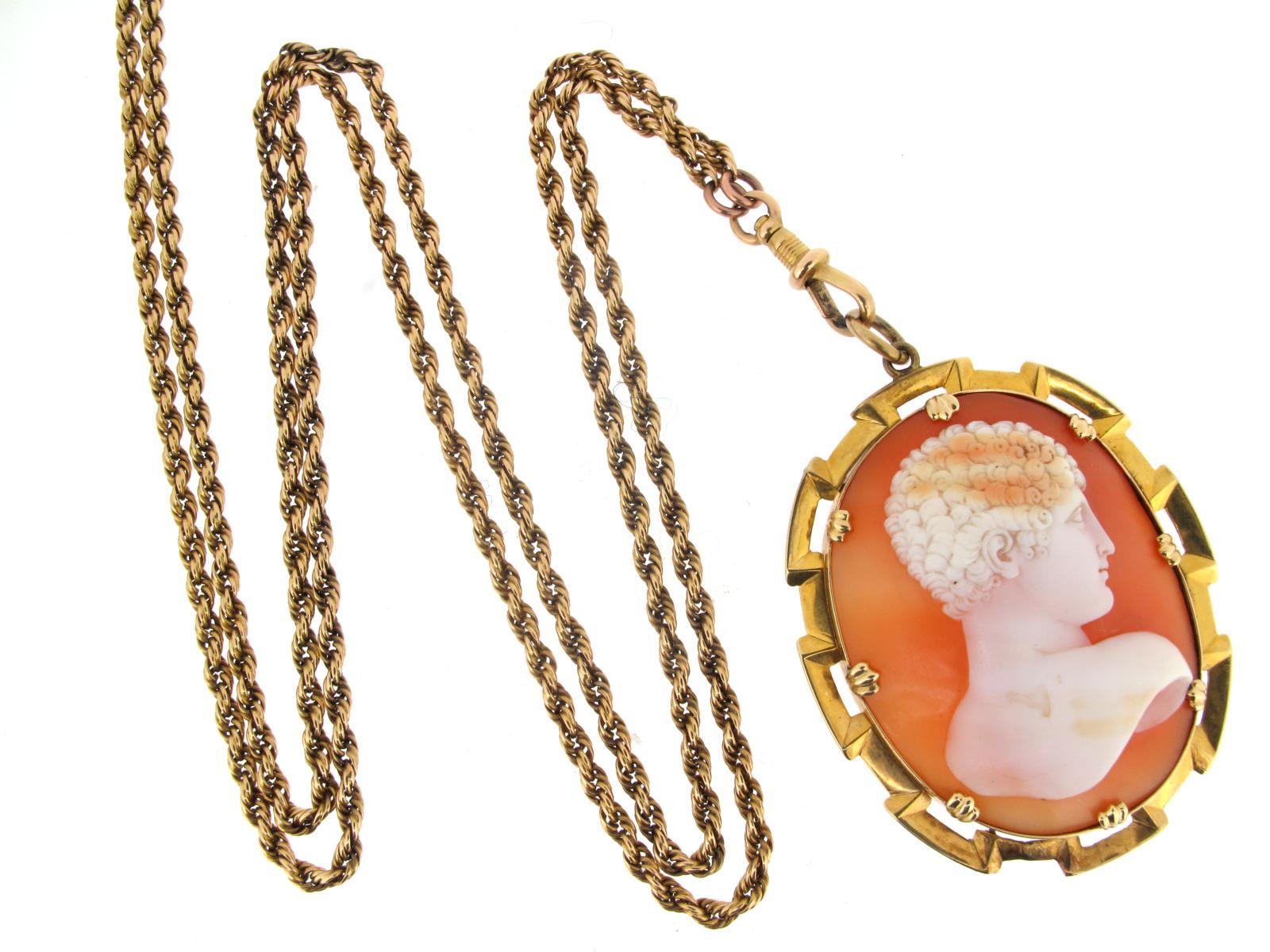 A 19th Century carved shell cameo pendant, depicting a young man with curly hair and with gold frame, on a gold long guard chain. The chain 170cm and 44g. The cameo 4cm high.