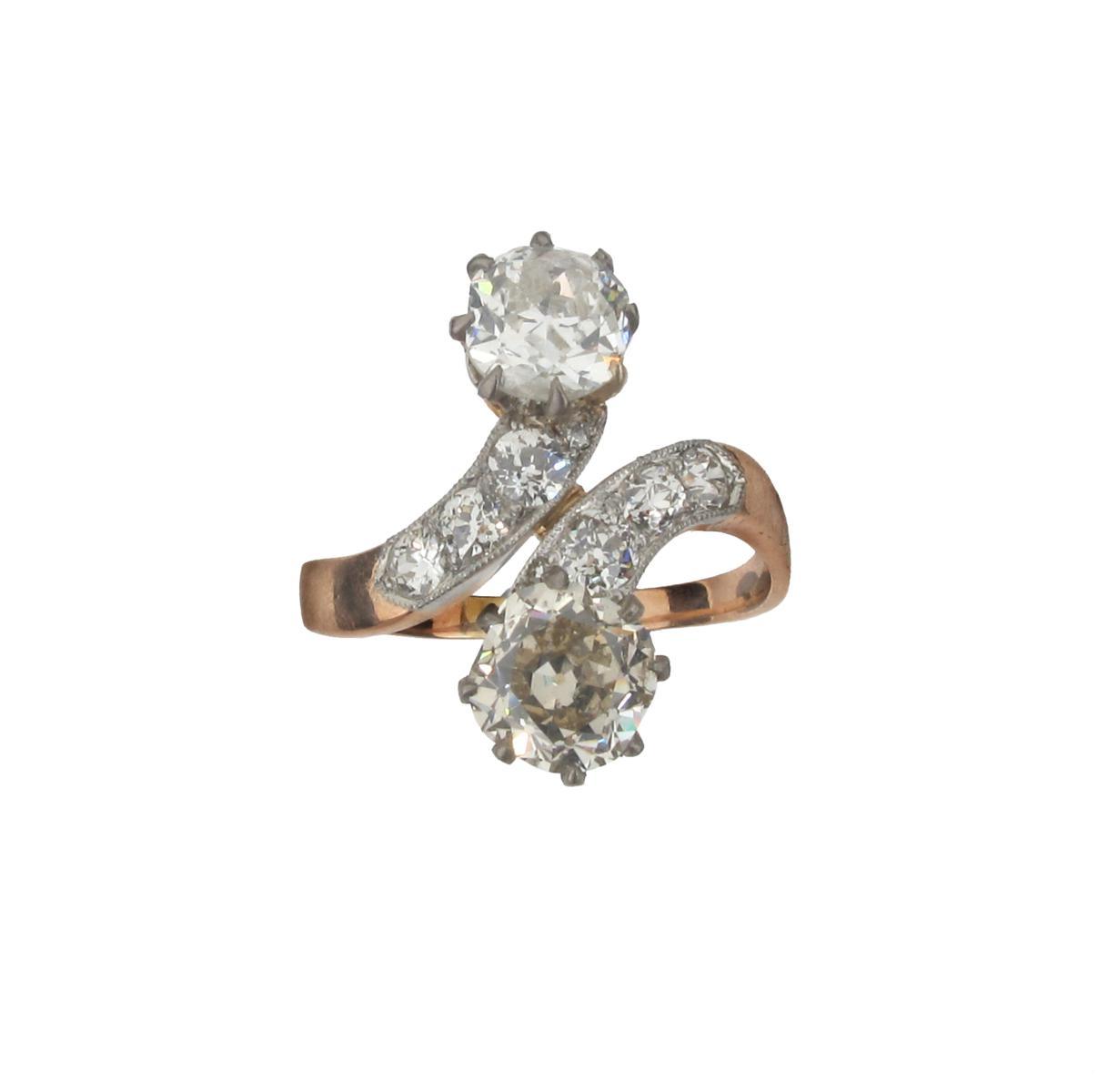 An early 20th Century diamond cross over ring. The two principle cushion shaped diamonds weigh approximately 3.20cts in total. Millegrain set with eight smaller diamonds in platinum and gold. Size Q