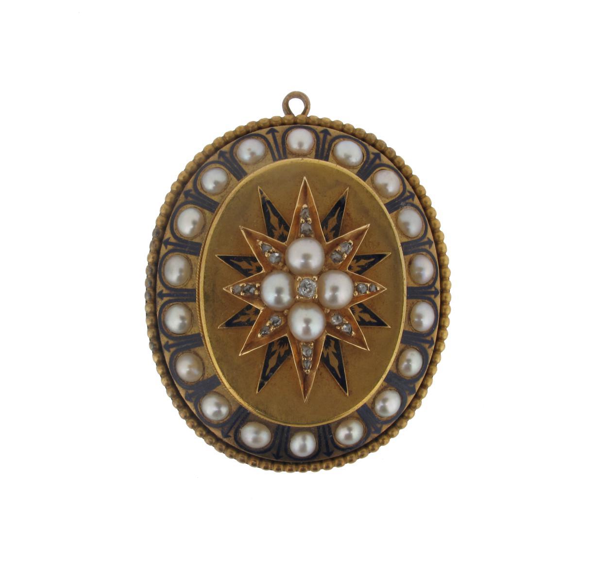 A Victorian oval gold locket brooch, centred with a star form section set with pearls and diamonds and within a half pearl border decorated with blue enamel. Glazed locket compartment to the reverse. 4.5cm wide.