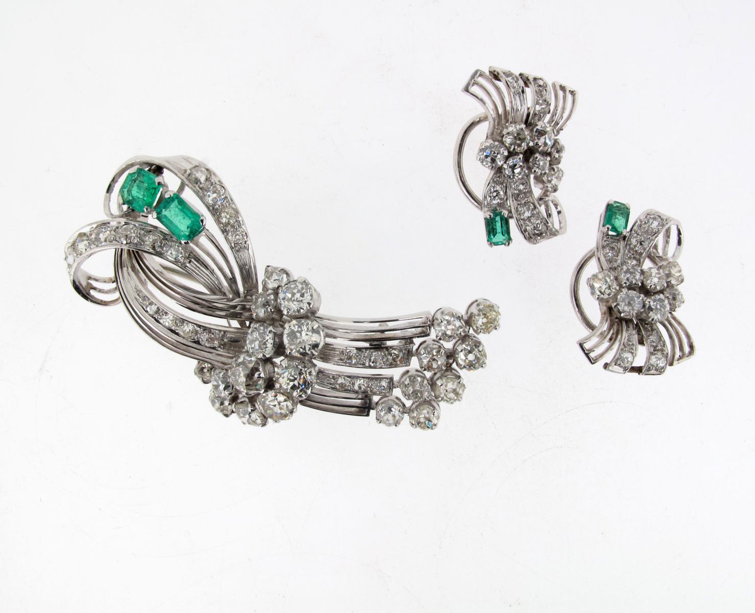 A diamond and emerald set white gold scroll brooch, set with graduated old circular cut diamonds and two emeralds. With matching emerald and diamond set white gold earrings. Circa 1950.