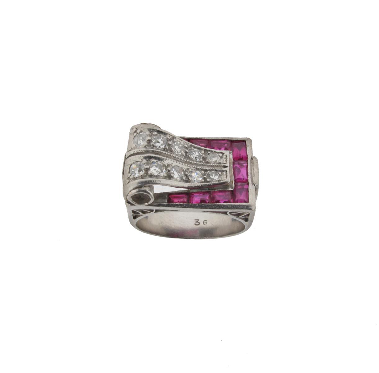 A white gold ring mounted with calibre cut rubies and a double scroll of graduated circular cut diamonds, circa 1940. Size O.