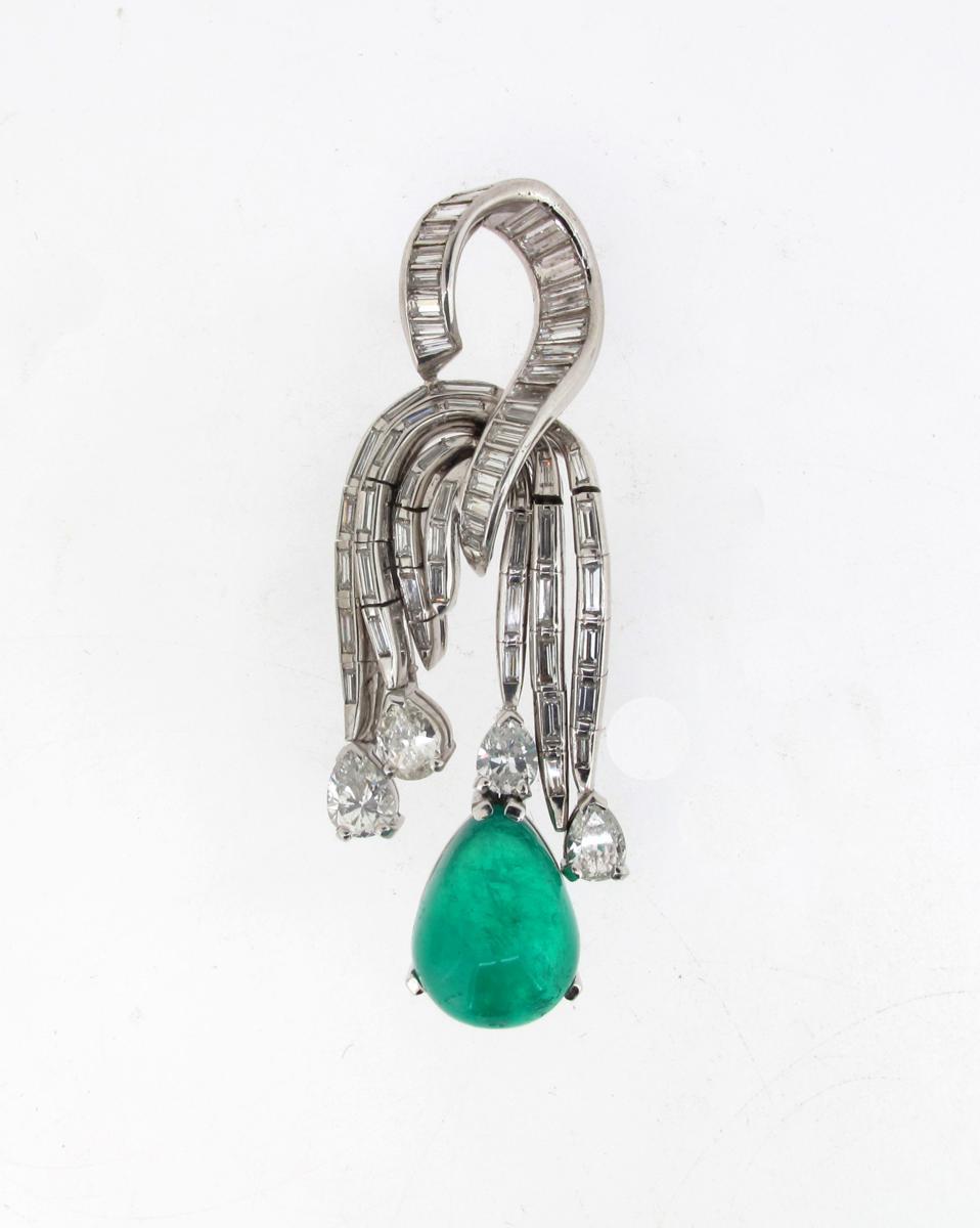 A diamond and emerald pendant, set with baguette shaped diamonds and the articulated drops terminating with four pair shaped diamonds, one also with a larger pear shaped cabochon emerald. Platinum. Circa 1950. 6cm high. Fitted case by S.J.Phillips.