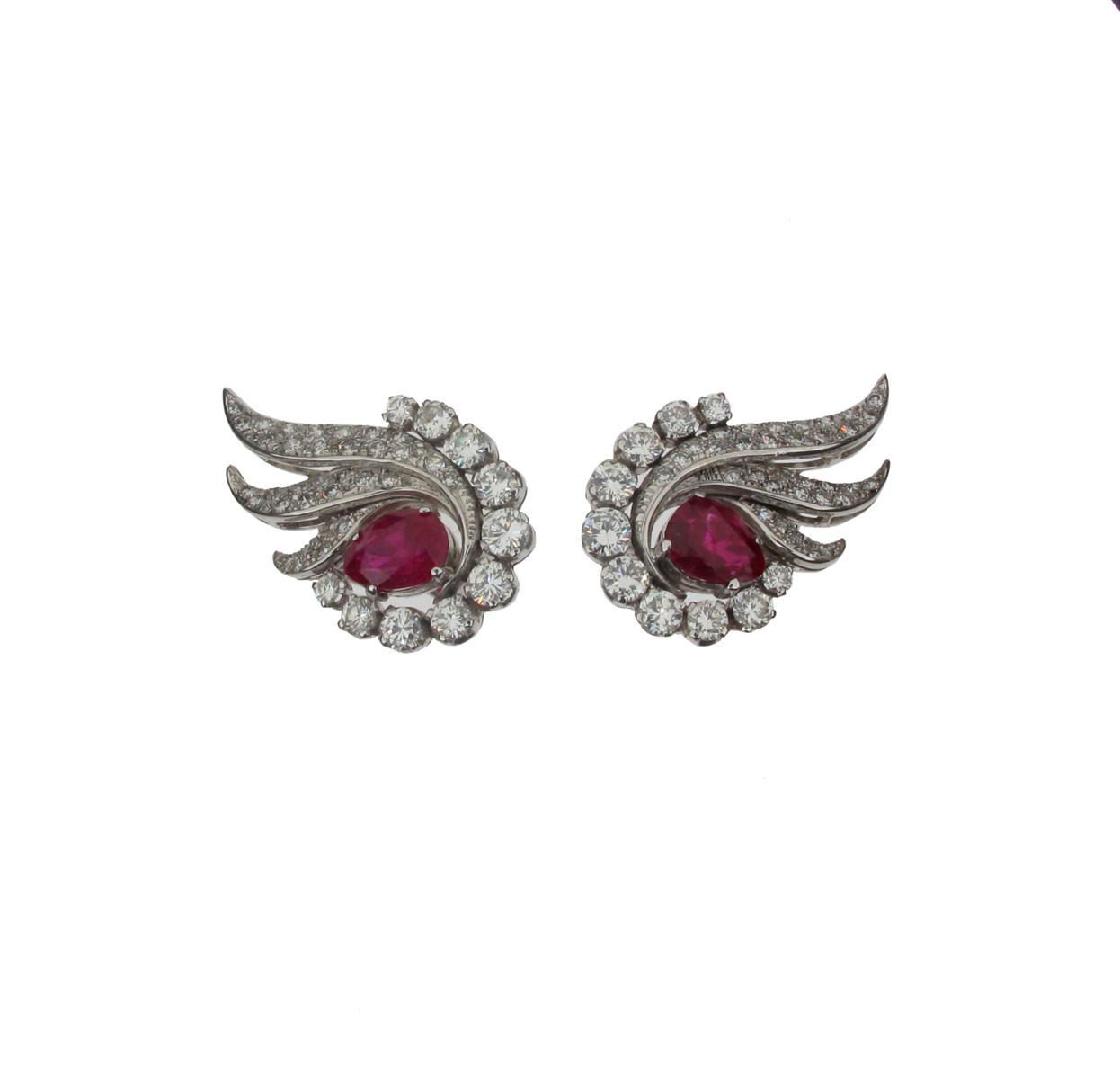 A pair of ruby and diamond scroll earrings, each earring is set with graduated circular cut diamonds and a pear shaped ruby in white gold.