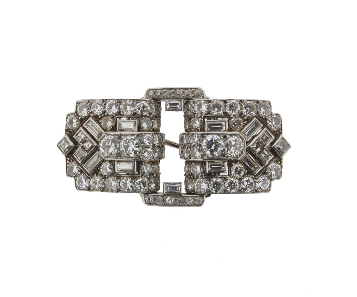 An Art Deco diamond set double clip brooch, set overall with graduated old circular cut and baguette shaped diamonds in platinum. 4.2cm wide. With additional white gold buckles to be sewn onto fabric. Cartier case.