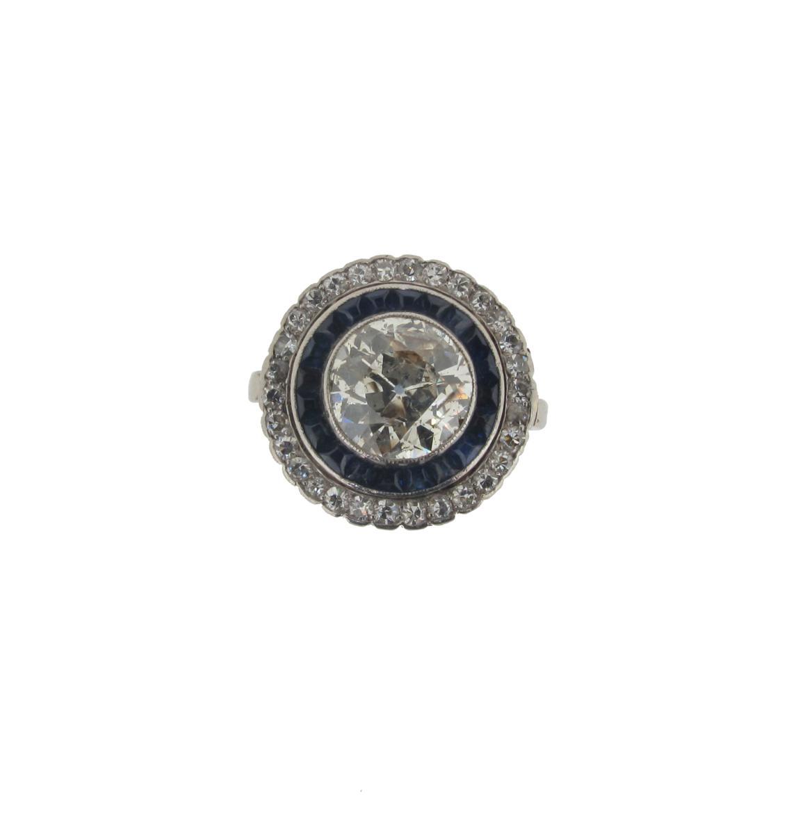 A diamond and sapphire cluster ring, the circular old cut diamond weighs approximately 2.10cts and is set within a surround of calibre cut sapphires and further border of circular cut diamonds in platinum and white gold. Size N.