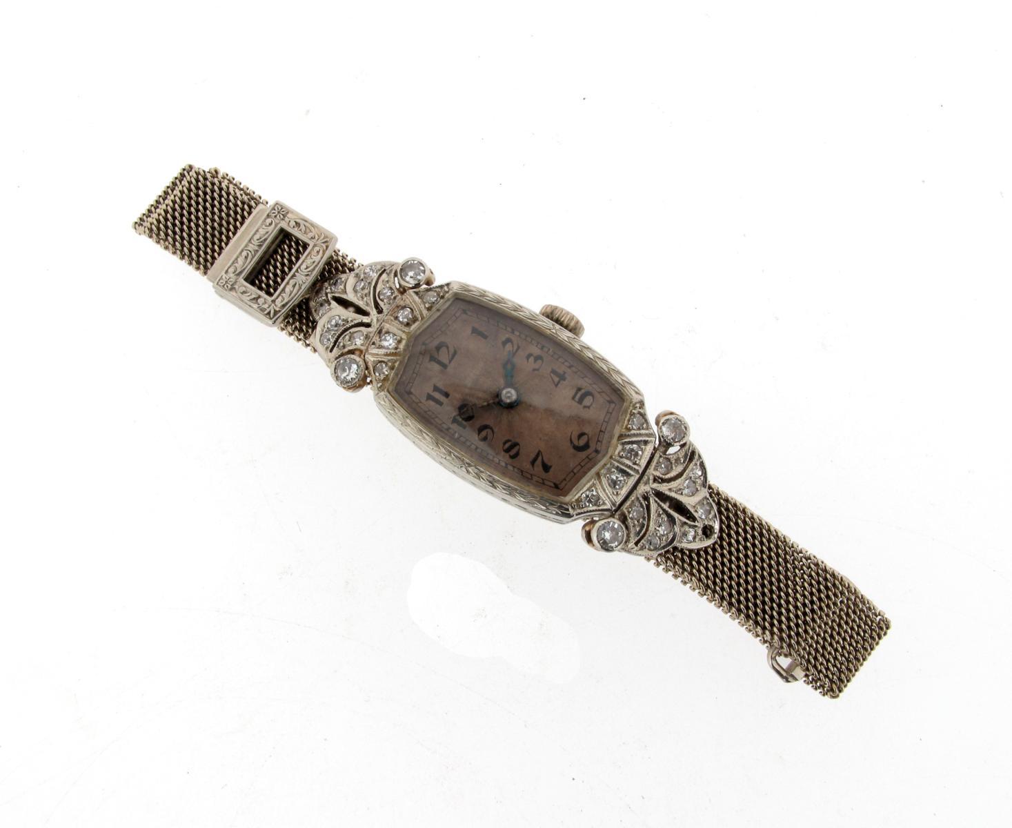 A diamond set 18ct white gold dress watch, movement by Rolex. Movement signed Rolex Prima. 15 rubies. Timed six positions. Case signed Rolex and RWC Ltd and import marks for Glasgow 1926. Reverse of case numbered 106 and 2632. The pierced foliate shoulders set with diamonds. Adjustable 18ct white gold mesh bracelet.