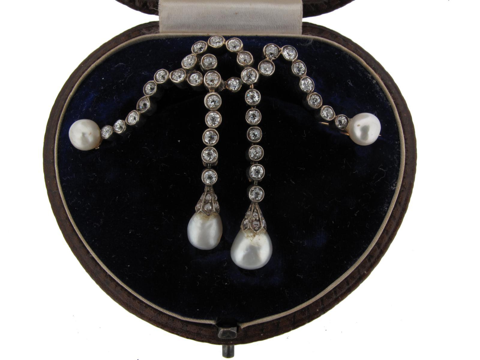 An unusual late Victorian diamond and pearl scroll brooch, the lines of circular cut diamonds each with an untested pearl terminal. Set in silver and gold. 5.5cm wide. Fitted case.