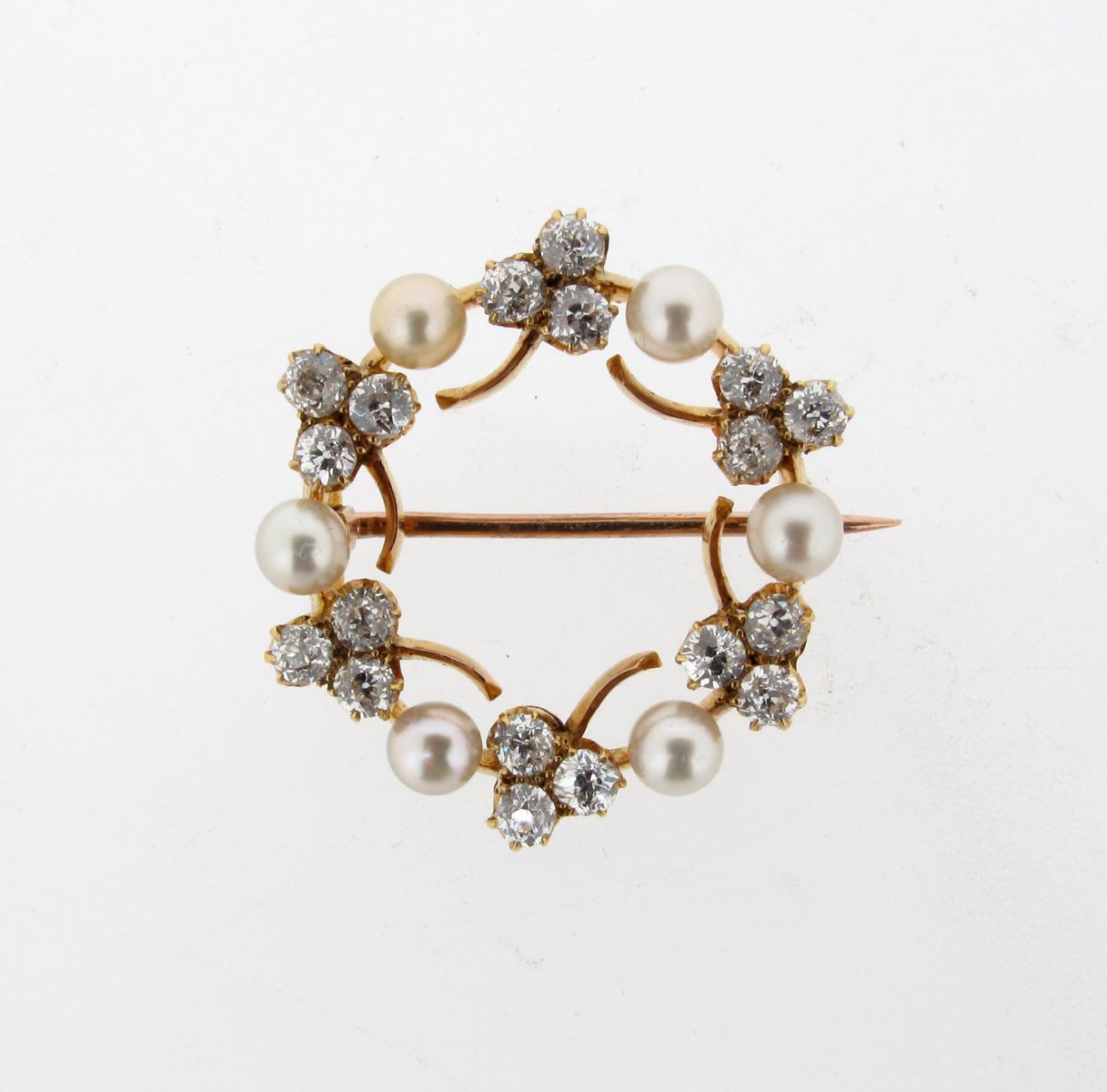 An Edwardian diamond and pearl set circular brooch, alternately set with pearls and foliate trefoils of circular cut diamonds in gold. Fitted case.