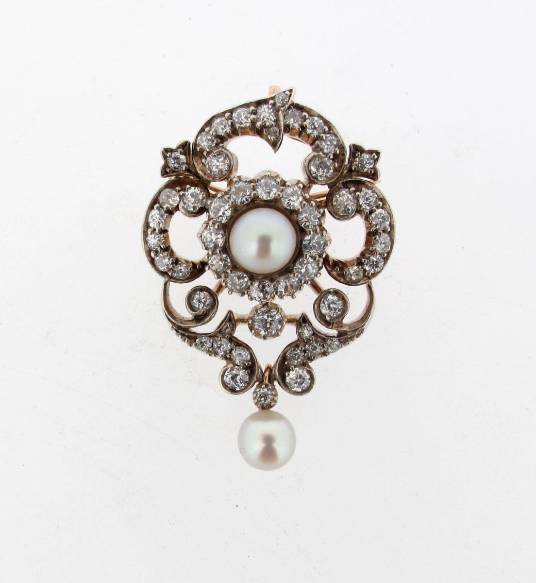 A late Victorian diamond and pearl brooch, the centre pearl and diamond cluster is set within diamond scrolls and suspends a further pearl. Set in silver and gold.