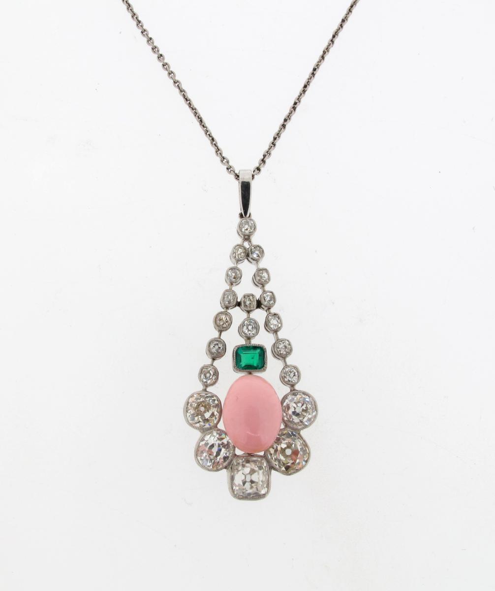 A conch pearl, diamond and emerald pendant, the pearl measures approximately 10.85 by 8.31 by 6.80mm deep. Millegrain set with an emerald and graduated cushion shaped diamonds in platinum and white gold. Fine link platinum neck chain. Case.