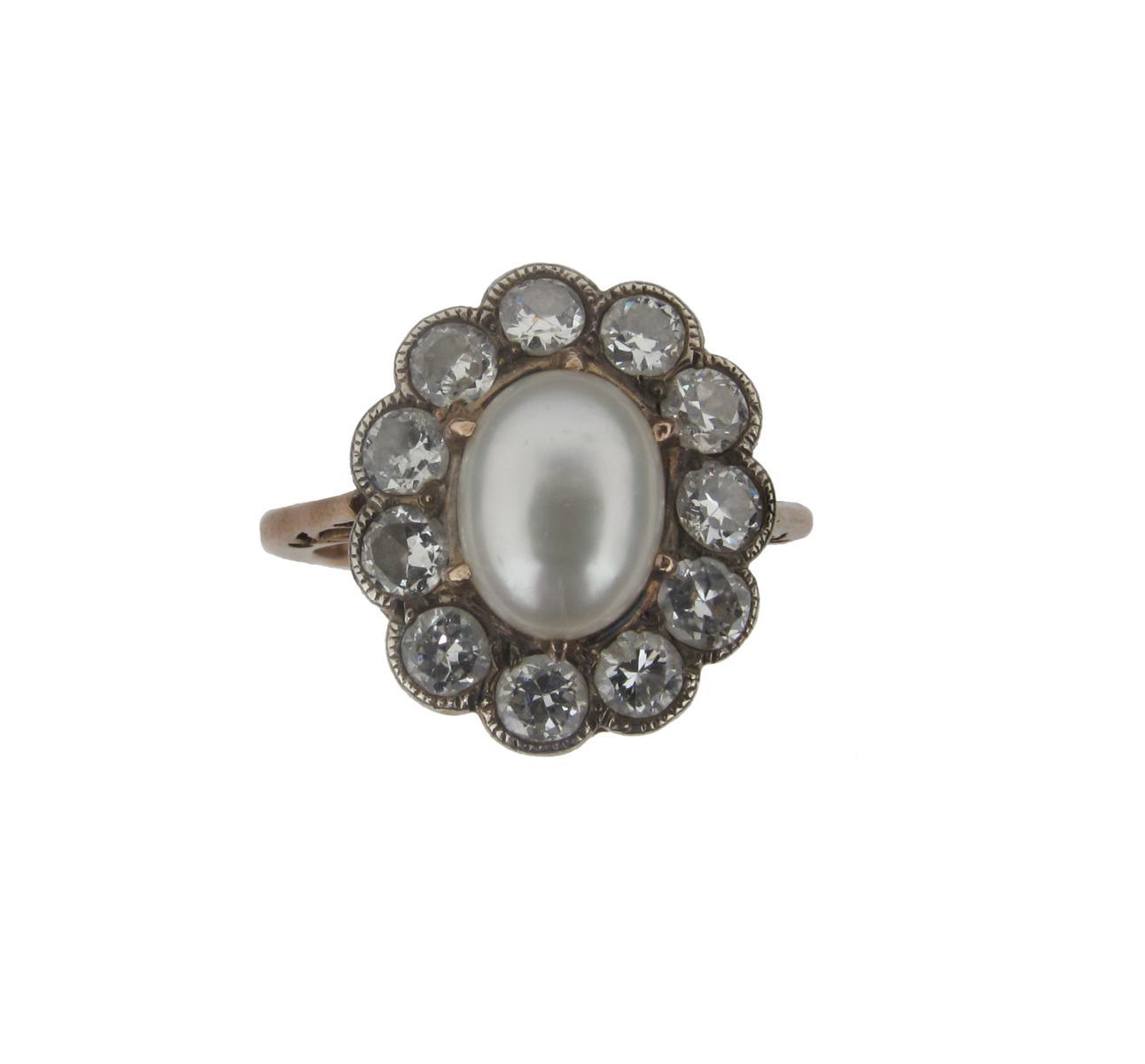 A pearl and diamond cluster ring, the untested oval shaped pearl is set within a surround of circular cut diamonds in gold. Size M.