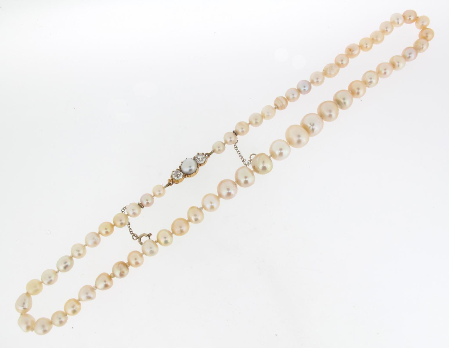 A single row graduated pearl necklace, the fifty seven natural pearls graduate from 5.2 to 10.2mm. the gold clasp set with a pearl and two cushion shaped diamonds. 45cm. 30.43g in total.