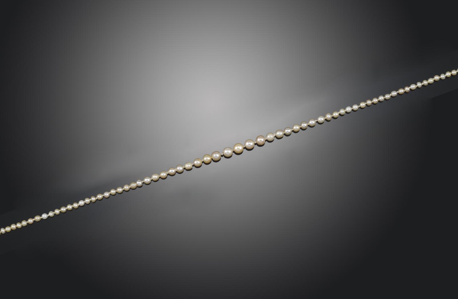 A single row graduated pearl necklace, the platinum clasp set with a pearl and two diamonds. With report number 05735 from the Gem and Pearl Laboratory stating that the 117 pearls graduate from 1.8-1.9 to 5.4mm and are all natural saltwater.