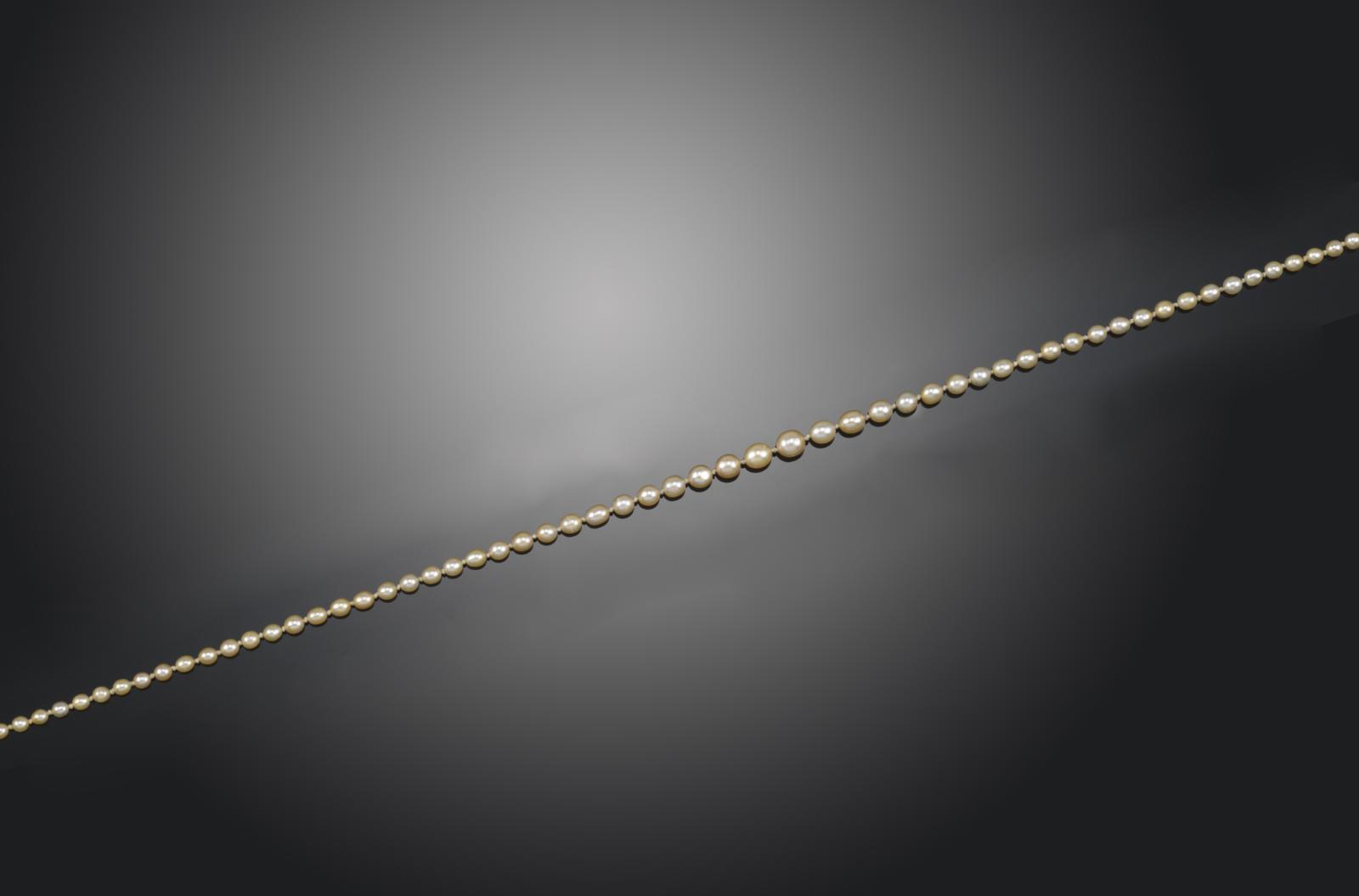 With report number 05736 from the Gem and Pearl Laboratory stating that the 96 pearls graduate from 2.8 to 4.7-4.8mm with one bead-nucleated cultured pearl and the remainder are all natural saltwater pearls.