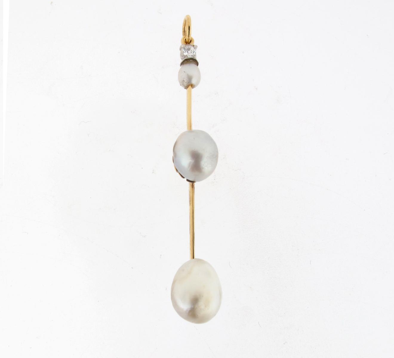 A gold pendant mounted with three natural pearls and a diamond. 5.5cm high. With report number...