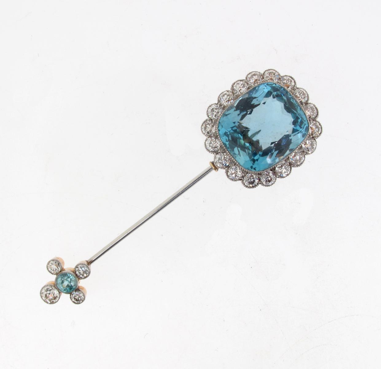 An Edwardian aquamarine and diamond jabot pin, the cushion shaped aquamarine is millegrain set within a surround of circular cut diamonds, the terminal set with a circular cut zircon and four further diamonds. 6.6cm long.
