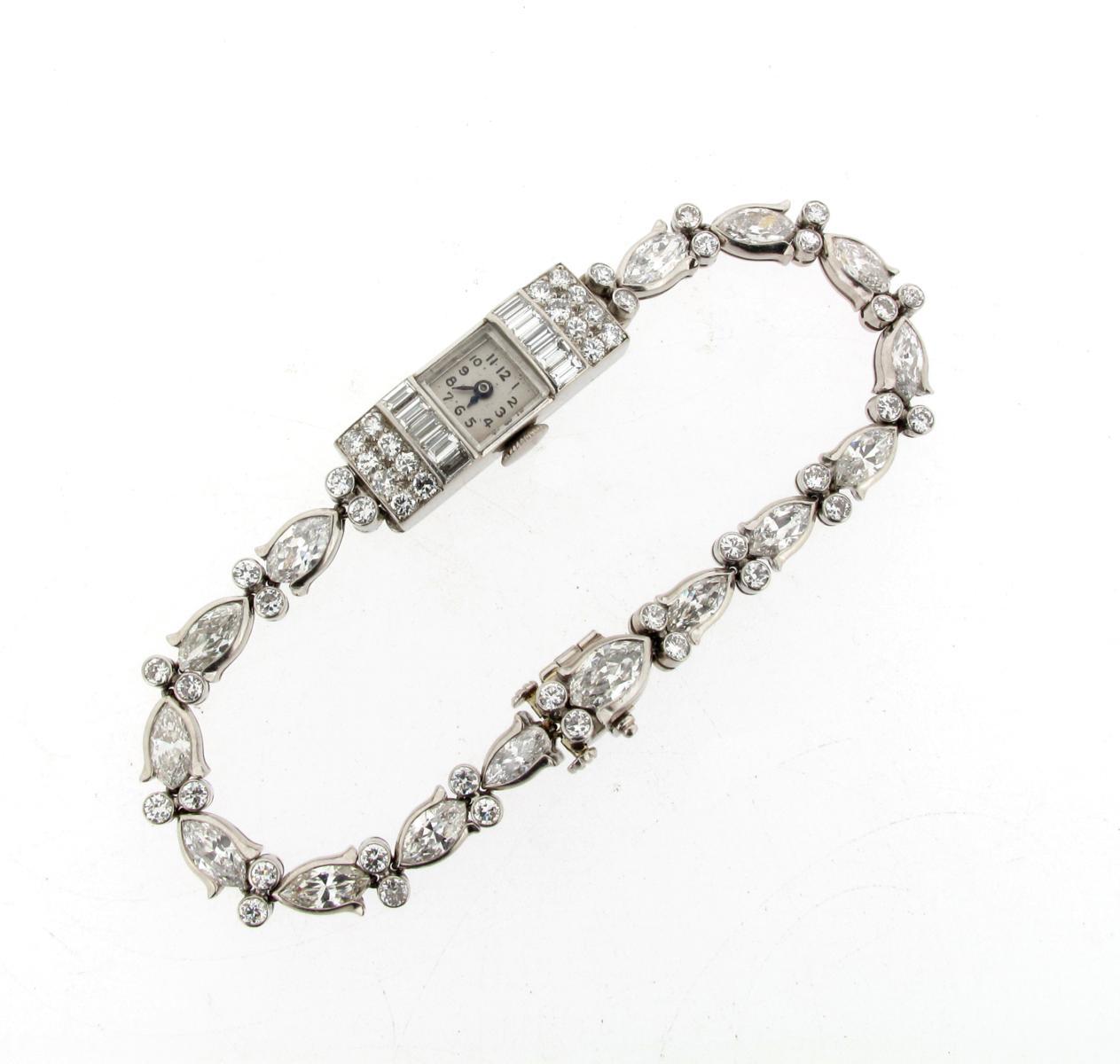 A diamond set dress wristwatch, the square dial with black Arabic numerals, the shoulders set with baguette shaped and circular cut diamonds in platinum. The band alternately mounted with marquise shaped and pairs of circular cut diamonds in platinum. The movement signed Eterna and numbered 2627225. 17cm.