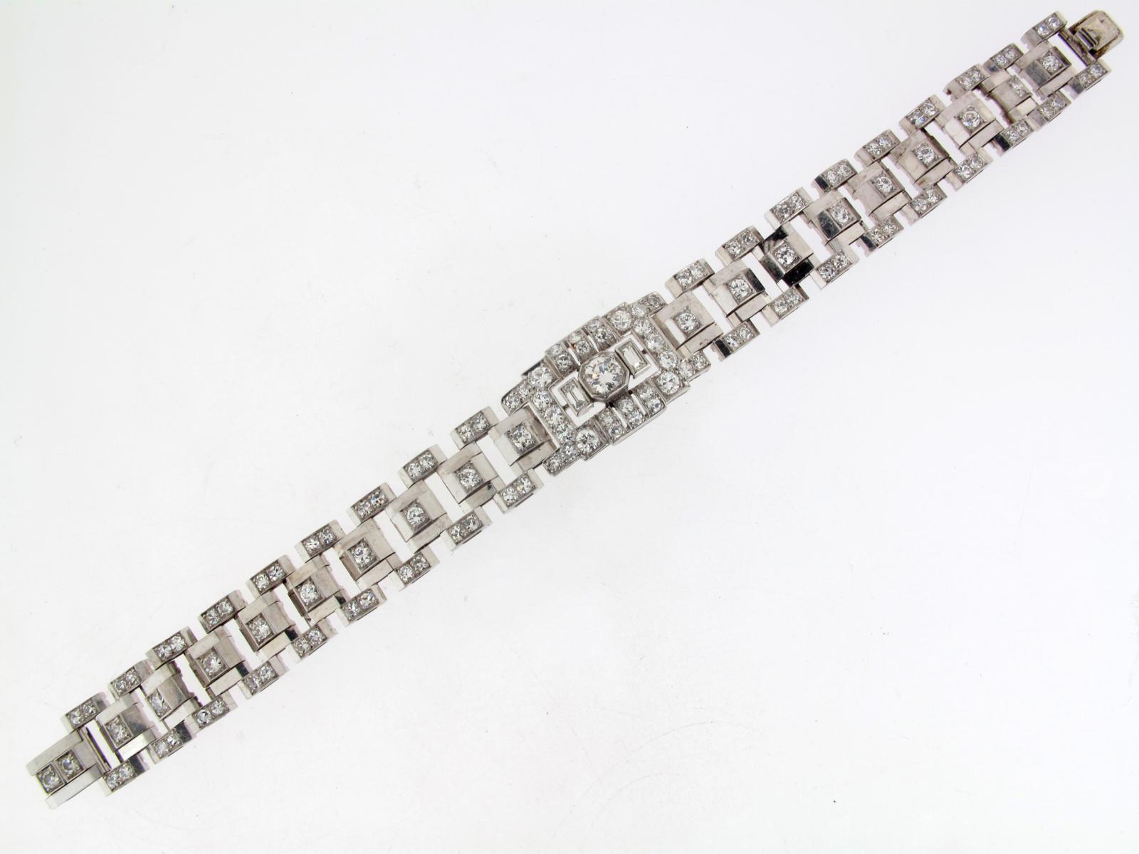 An Art Deco diamond set platinum stylised tank track bracelet, centred with a circular cut and two baguette shaped diamonds with further diamonds set to the articulated links. With partially rubbed makers mark, possibly French. 17.5cm. Fitted case by Nicaud of Dinard.