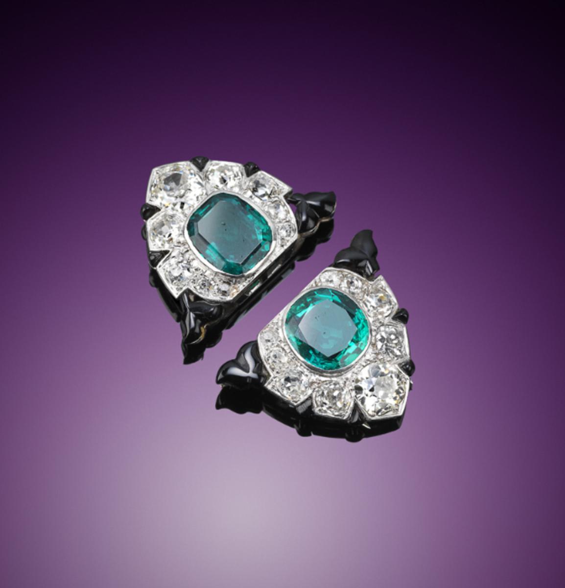 A pair of Art Deco emerald diamond and black onyx clip brooches