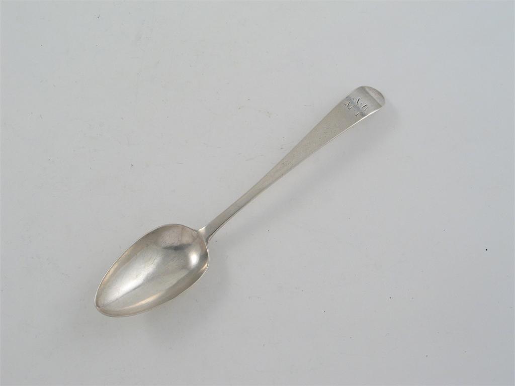 A George III Irish tablespoon, with a pointed end, initialled "AB" over "MI", by J. Pittar, Dublin 1790, 2.4oz.