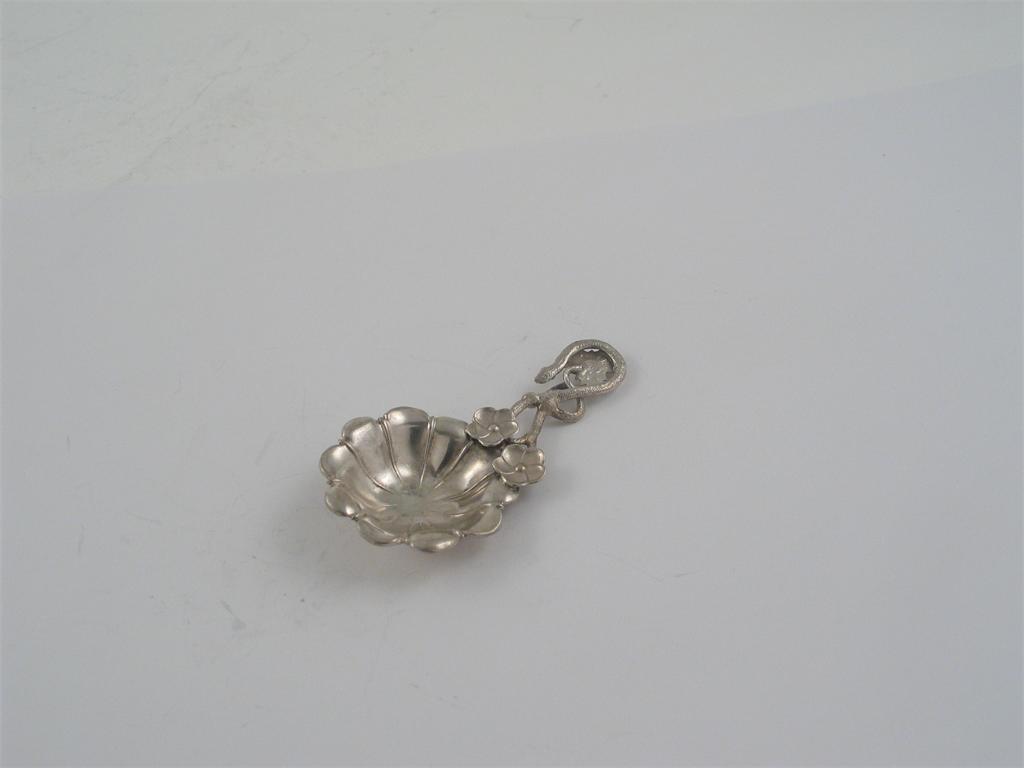 A Victorian floral caddy spoon, with a tendril handle and two small flowerhead motifs on the edge of the bowl, by Hilliard & Thomason, Birmingham c.1850 (no date letter).