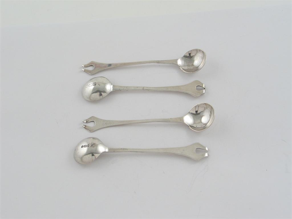 Four Arts & Crafts salt spoons, with horned terminals: one pair by L G Connell, Birmingham 1912 and two singles by Messrs Hutton & Sons (one London 1900, the other Sheffield 1908). (4)
