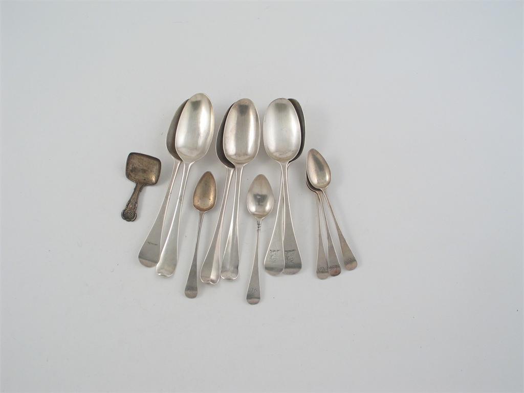 Mixed flatware: Six antique rattail tablespoons, four Aberdeen-made teaspoons, by Jhn Leslie, a Dundee teaspoon by William Constable, and a caddy spoon with an Hourglass stem, 12oz. (12)