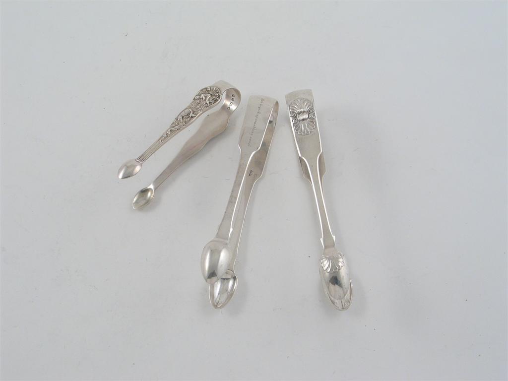 Three pairs of sugar tongs: a small Bacchanalian pair