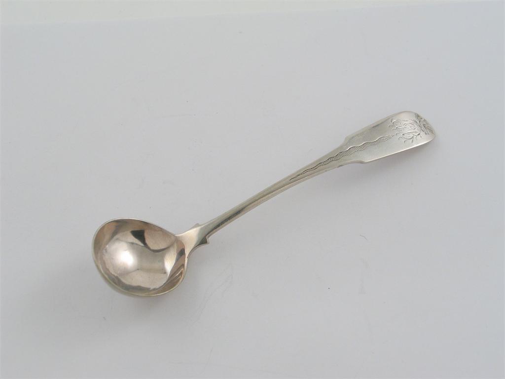 A 19th century unascribed small ladle, fiddle pattern, engraved with a serpent, below a crest and the initials "GB", maker "AFC" and an unidentified town mark, probably early 19th century, 5.5in (14cm) long, 0.7oz.`
