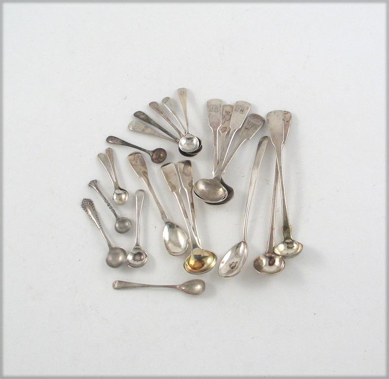 Assorted condiment spoons: Six fiddle pattern salt spoons, two antique Scottish fiddle condiment ladles, an Edwardian mustard spoon, and thirteen small late Victorian/modern salt spoons, 5.5oz. (21)