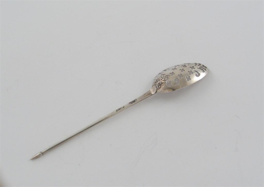 A George II fancy back mote spoon, with a flower head and scrolls below the drop, initialled E and pierced with crosslets and scrolls, by Marmaduke Dainthey, London c.1745, 4.9in (12.5cm).