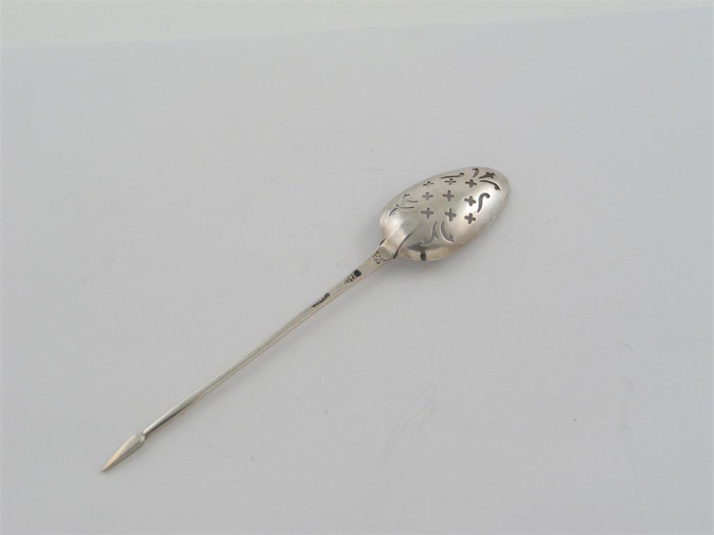 A George III mote spoon, with an extended drop, large finial, scratched initials 'F.S', maker's mark struck twice "T, mullet, R", 1760-1770, 5.4in (13.6cm).