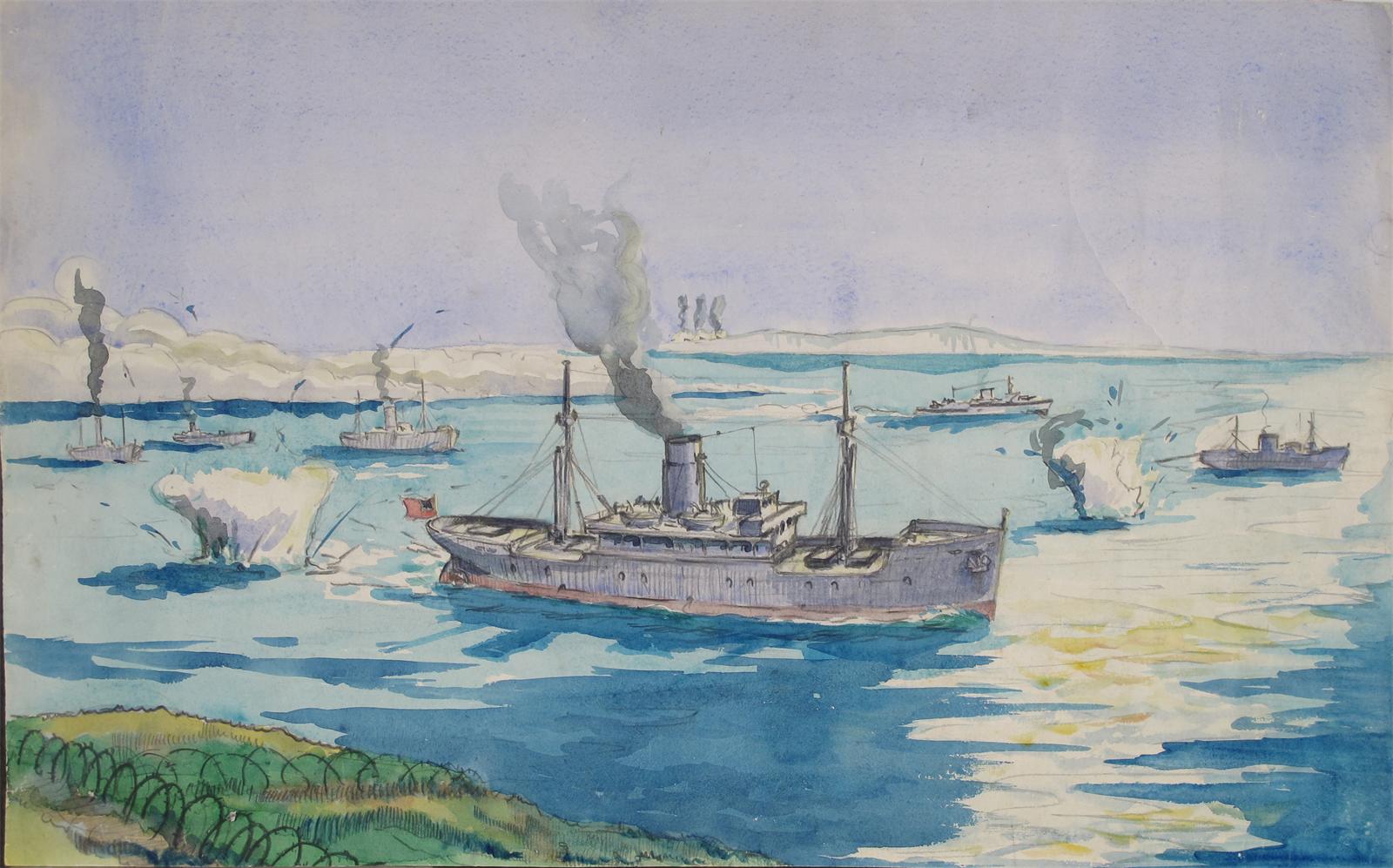 ‡Alastair Flattley (Scottish 1922-2009) A wartime shipping convoy off the coast; Trail of a V2...