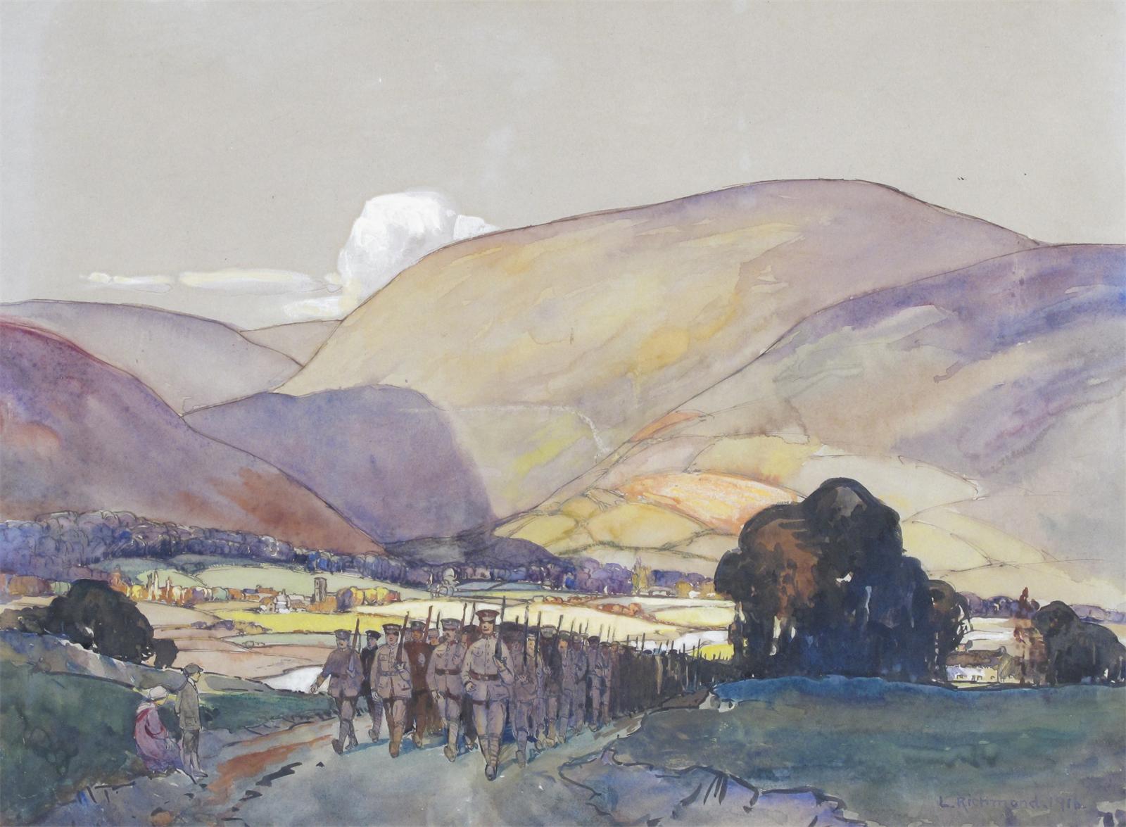 ‡Leonard Richmond (1889-1965) A Company of Infantry marching in a highland landscape Signed and...