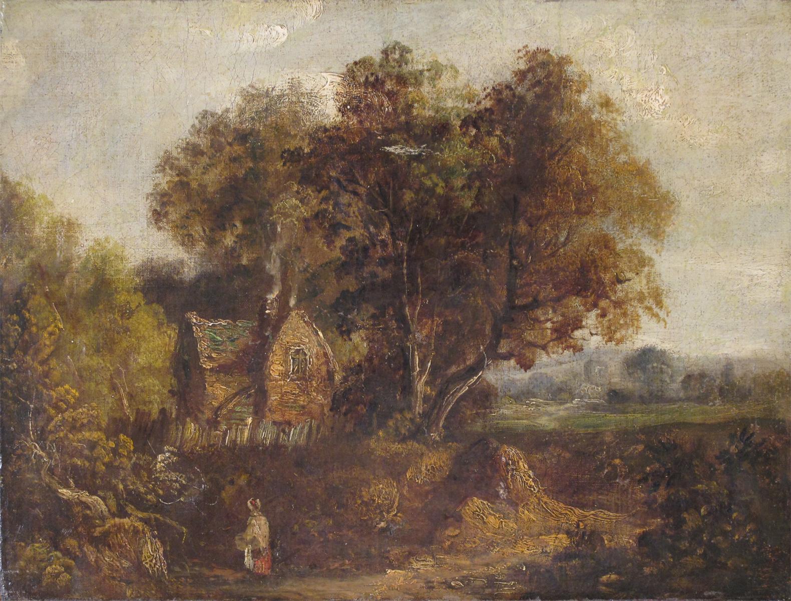 Follower of John Constable A woman by a cottage in a rural landscape Oil on panel, unframed 33 x 43cm; 13 x 17in