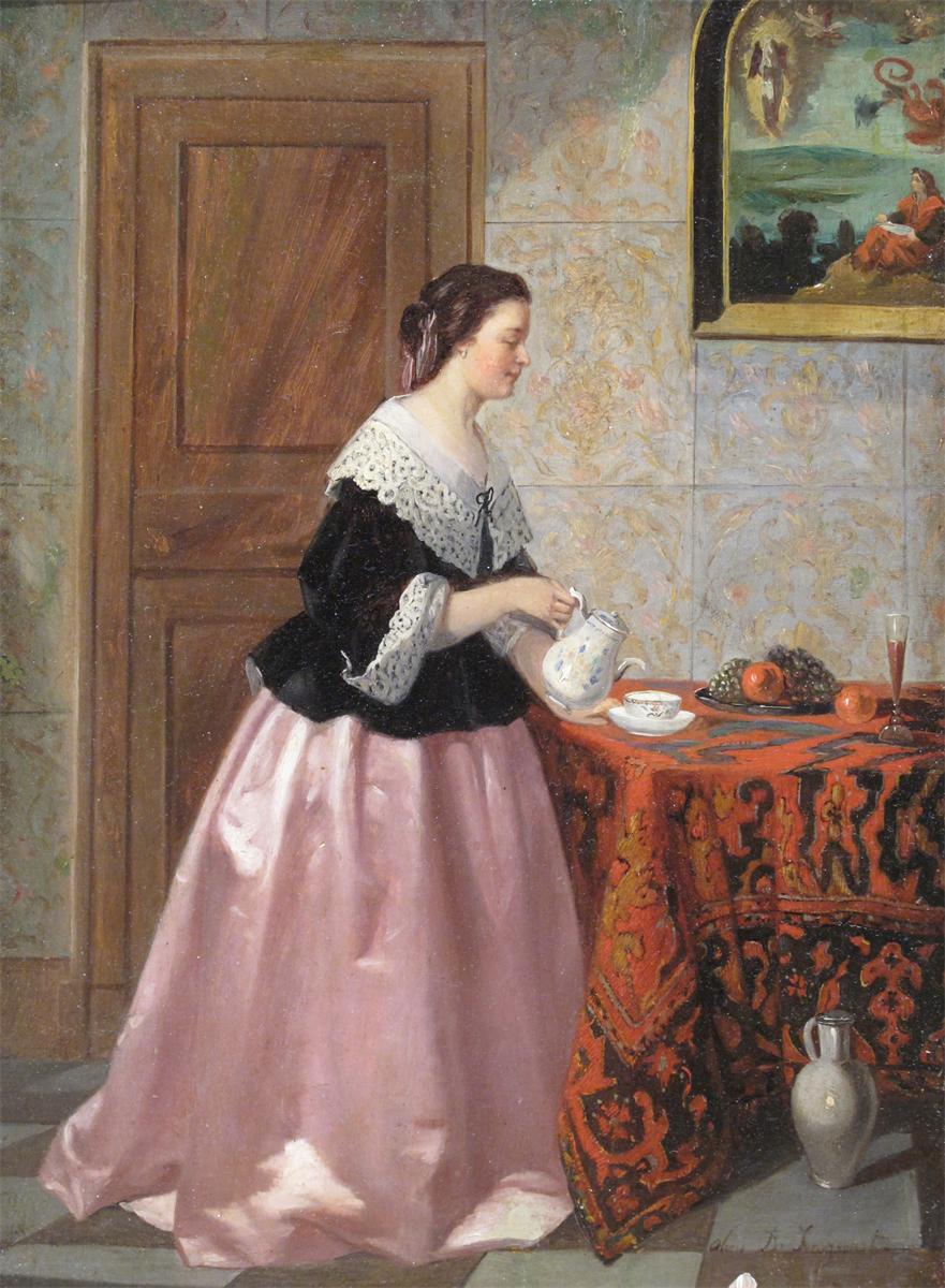 Aline de Senezcourt (French 19th Century) A lady pouring coffee Signed Oil on panel 22 x 30cm; 8½ x 11¾in