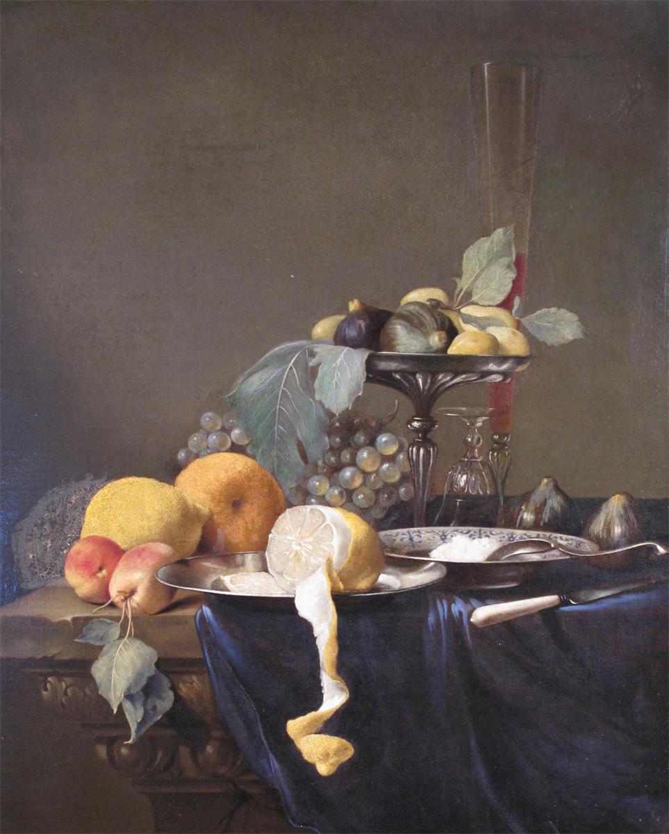 Dutch School 17th/18th Century Still life of figs, lemons, oranges peaches and grapes on a table with a tazza and other tableware Oil on canvas 70 x 56cm; 27½ x 22in