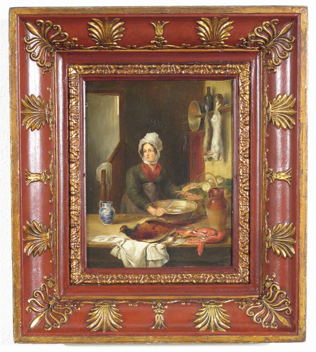 Alexander George Fraser Sen. (Scottish 1786-1865) A kitchen interior Signed A. Fraser lower right, also titled and dated 1841 on a label verso Oil on panel 27 x 21cm; 10½ x 8¼in