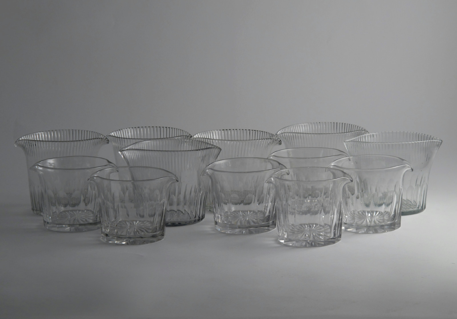 Two sets of six glass coolers 18th century and later, the larger set cut with oval facets and ribbed rims, the smaller with large oval facets, both on star cut bases, 11cm high max. (12)