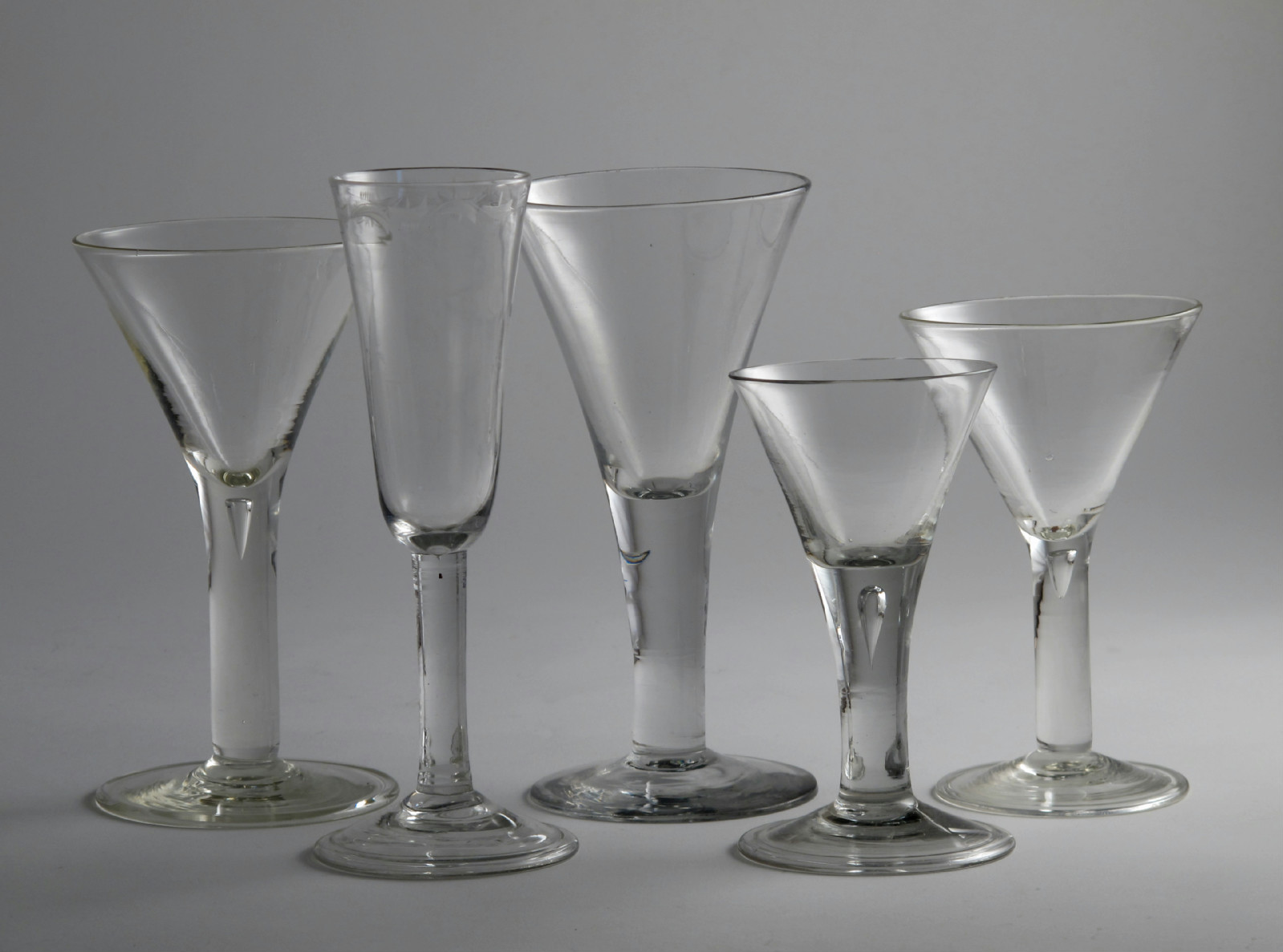 Five large wine glasses 2nd half 18th century and later, all raised on plain or teardrop stems, four on folded feet, 20.5cm max. (5)