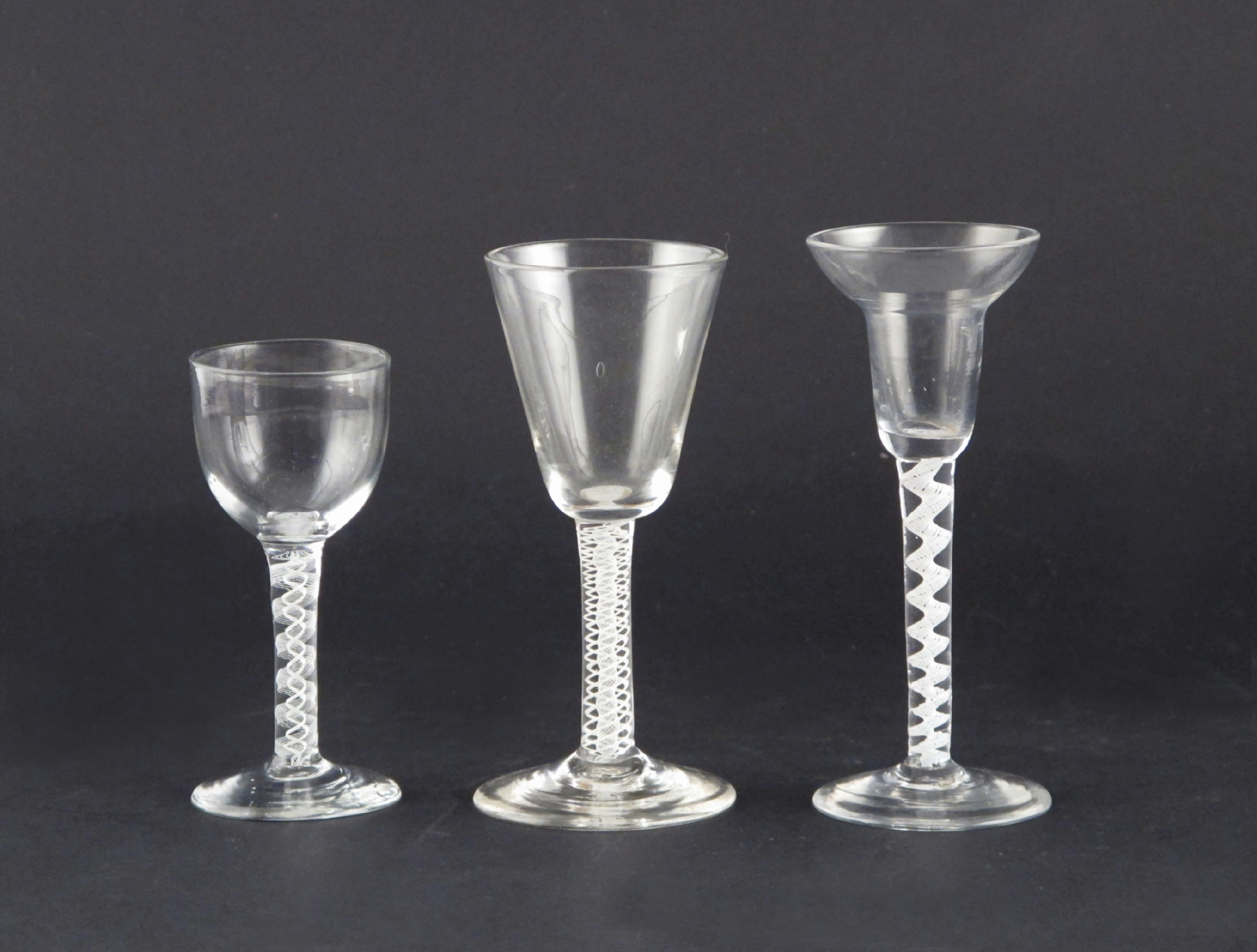 Three wine glasses 18th century, one with a pan-topped bowl, one bucket-shaped, all raised on varying opaque twist stems, 15.8cm max. (3)
