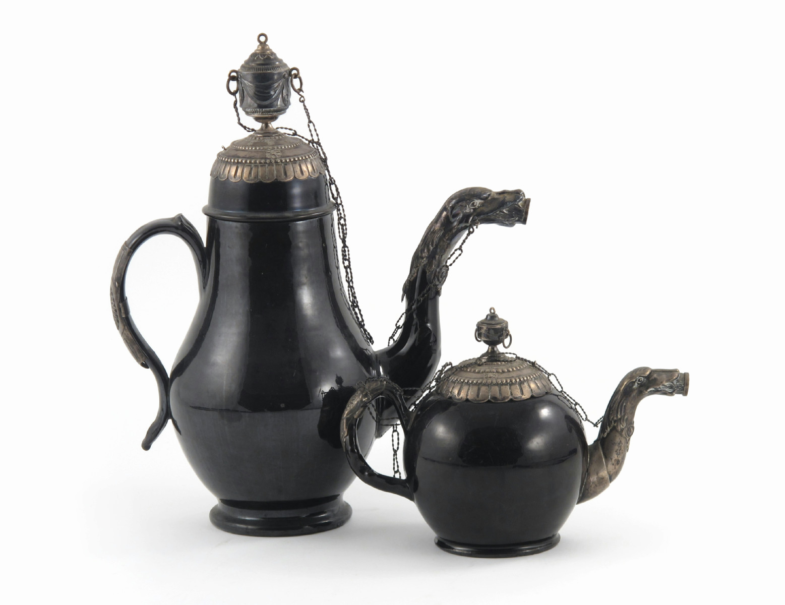 A large black-glazed stoneware coffee pot and similar teapot probably 19th century