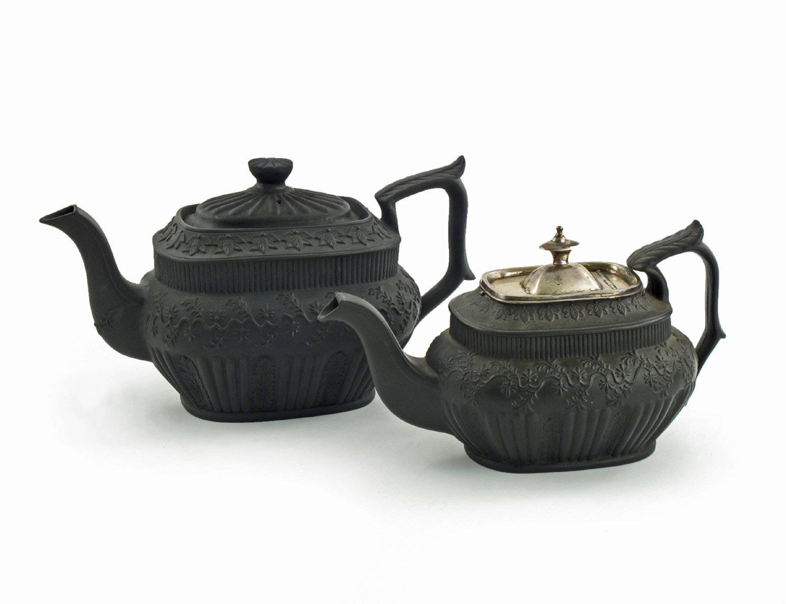 Two black basalt teapots 19th century, each applied with a band of berried leaves above an undulating leafy border, one with a hinged silver lid, hallmarks for Birmingham 1896, the other with a basalt cover, 25cm max. (3)