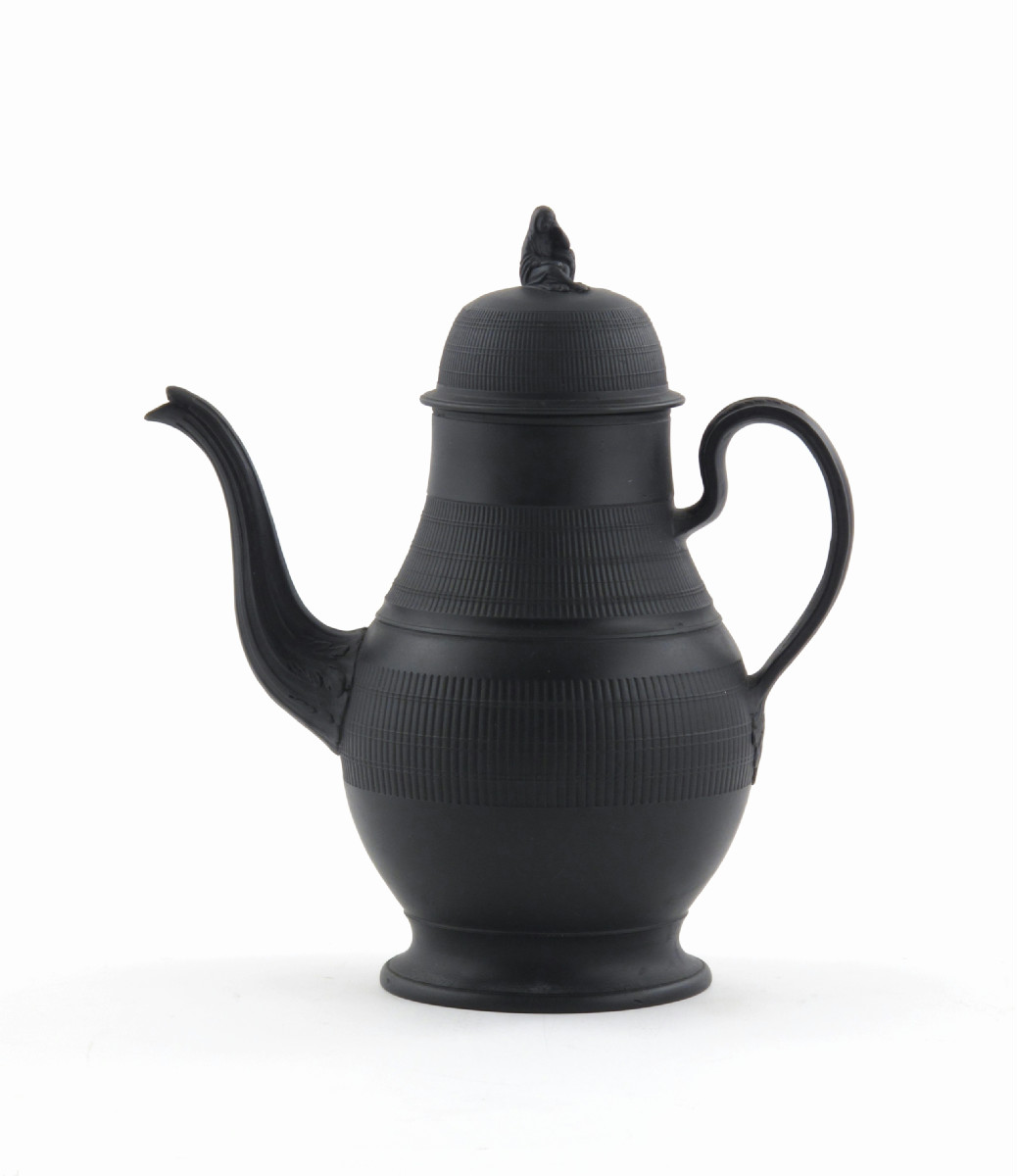 A large black basalt coffee pot and cover 19th century, turned with wide bands, the cover surmounted with a sibyl finial, 27.5cm. (2)