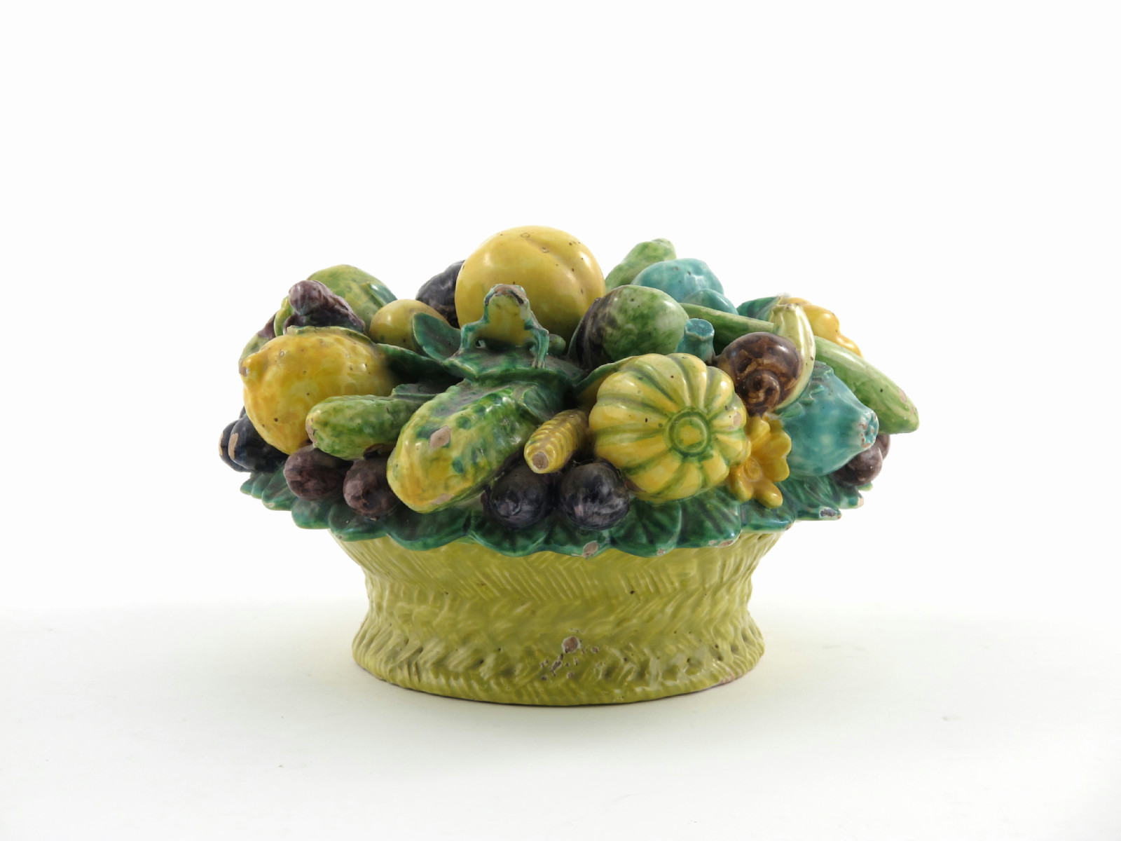 A Cantagalli model of a fruit bowl late 19th century, with various fruits, gourds and seeds surmounted with a snail, a small frog and a cricket, cockerel mark, some chips, 28cm dia.