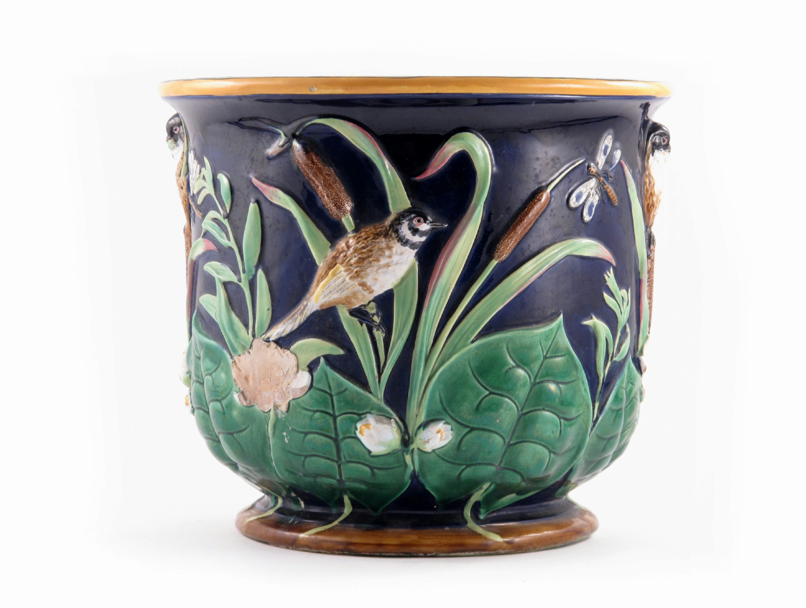 A large George Jones Majolica jardinière 2nd half 19th century, decorated with sparrows and dragonflies amidst bulrushes and above waterlilies on a deep blue ground, the interior glazed turquoise, some damages, 31cm high.