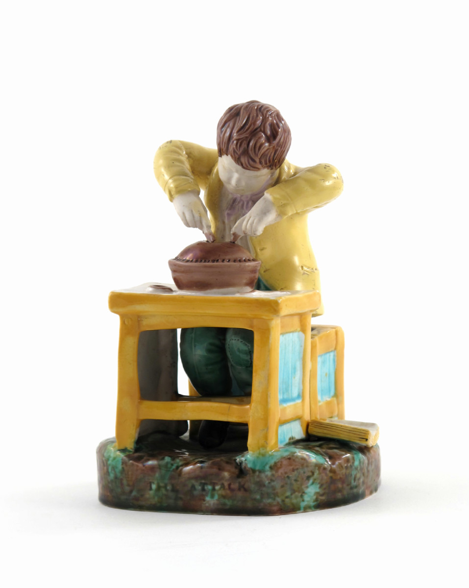 A Majolica figure of a boy 19th century, titled 'The Attack', he digging into a large pie on the table before him, his book open and disregarded by his side, a short crack to the table leg, 18.5cm.