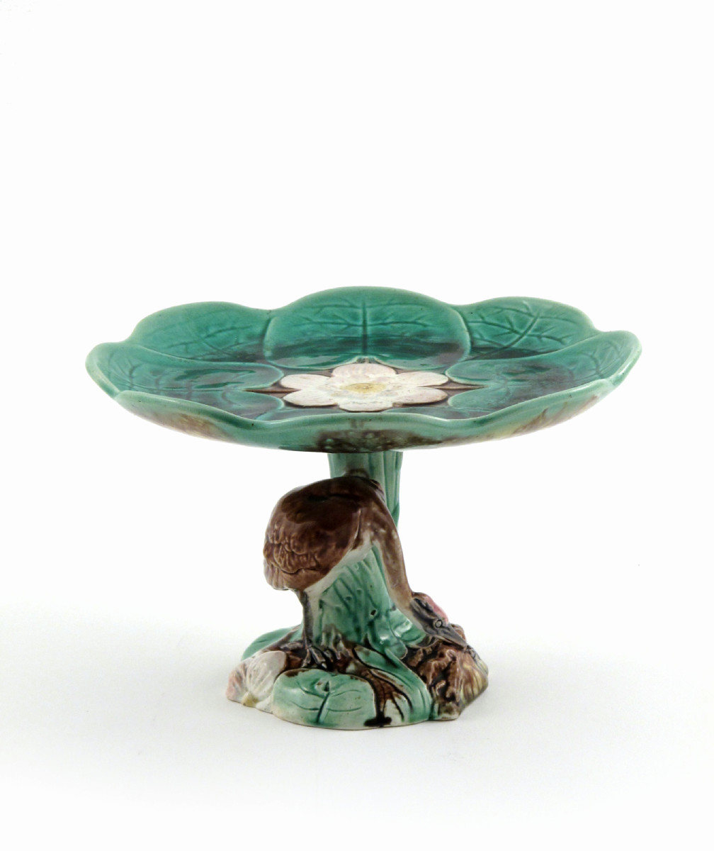 A Majolica tazza 19th century, modelled with a crane beneath a wide waterlily dish supported by a stem of bulrushes, 16cm high.